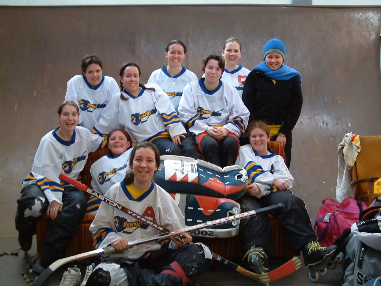 The photo below is from their 2002 journey to the South Island Regional Inline Hockey Championships. Clockwise from top left: Emma Gordon, April George, Kezia Bibby, Tasha Szeto, Kate Williman, Martel Letica, Becky Szeto, Kerry Perkins and Natalie Syddal.