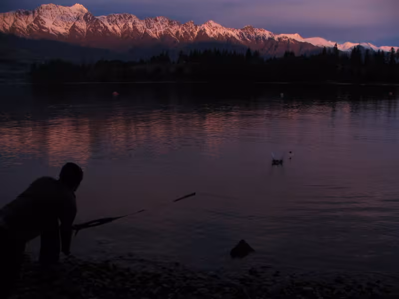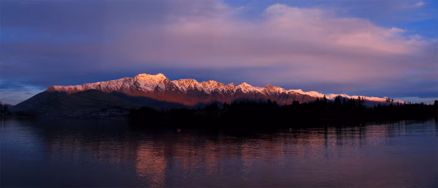 Here’s a panoramic photo I took of the Remarkables from the Queenstown ice rink. And here’s a photo I took of Ted skimming a stone across Lake Wakatipu.