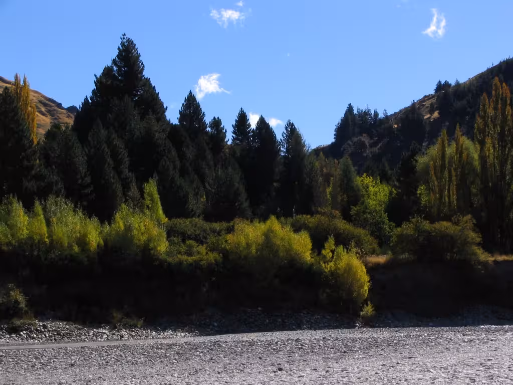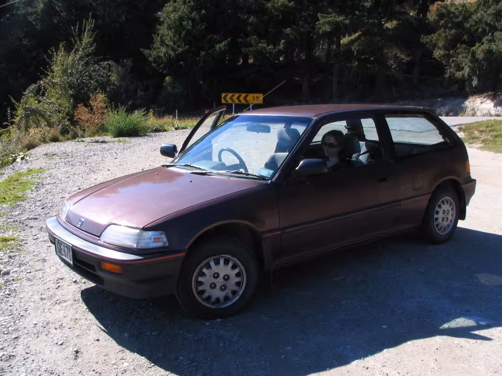 Panorama of the hillside beside the Shotover river. High resolution version.View from ArrowtownView from the top of the zigzag on the Crown Range. High resolution version.Closeup of the trees beside the Shotover riverLake WanakaThe mighty Honda Civic at the top of the zigzag on the Crown Range