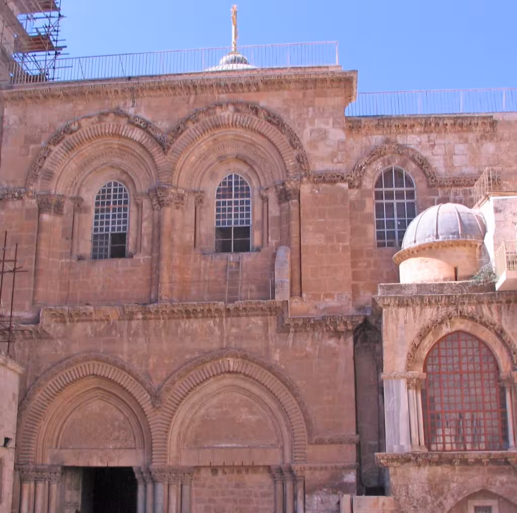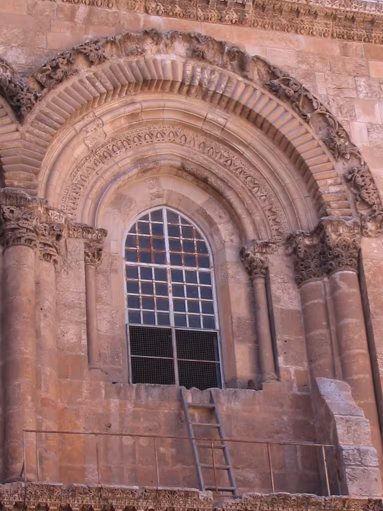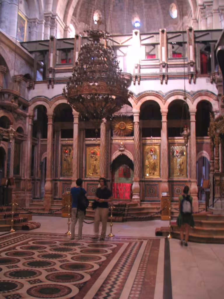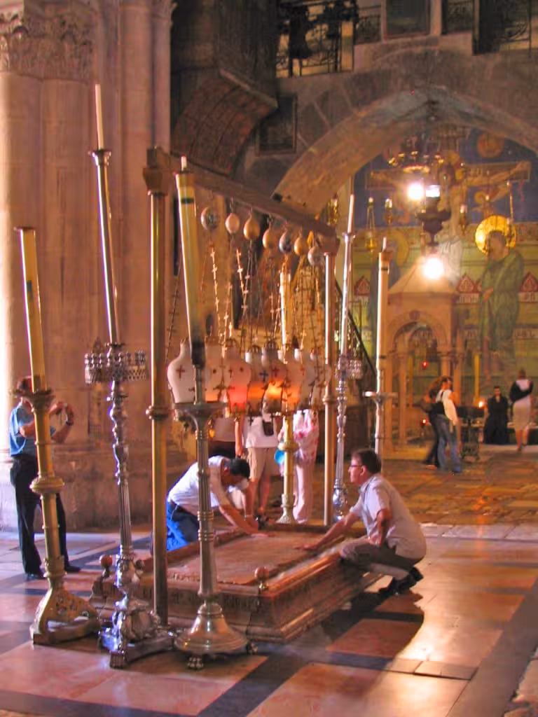 I visited the Church of the Holy Sepulchre in Jerusalem. It is built on the site where Jesus Christ was supposedly buried. The Stone of the Anointing A tomb The supposed tomb of Jesus Christ The Greek Orthodox Catholicon The imovable ladder. The ladder hasn't been moved in over a hundred years
