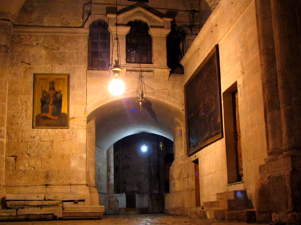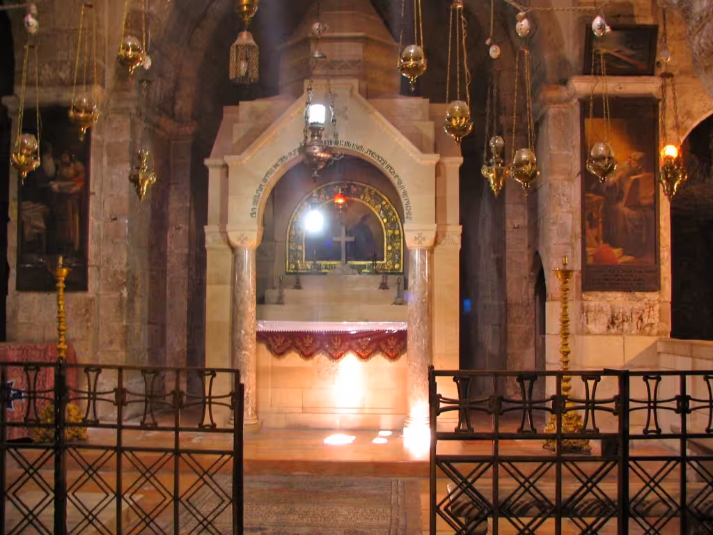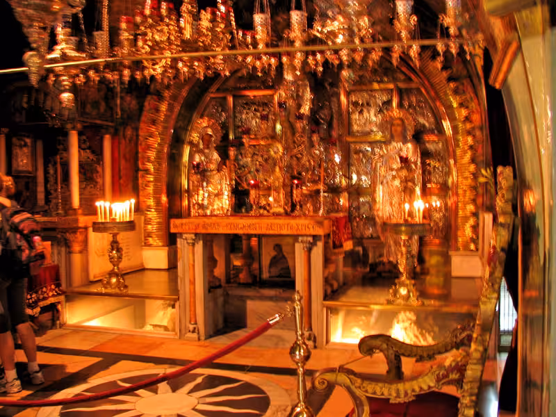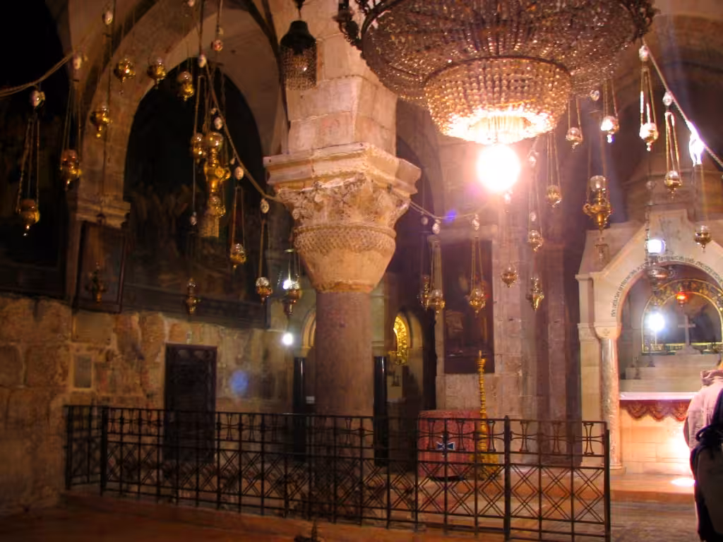 I visited the Church of the Holy Sepulchre in Jerusalem. It is built on the site where Jesus Christ was supposedly buried. The Stone of the Anointing A tomb The supposed tomb of Jesus Christ The Greek Orthodox Catholicon The imovable ladder. The ladder hasn't been moved in over a hundred years