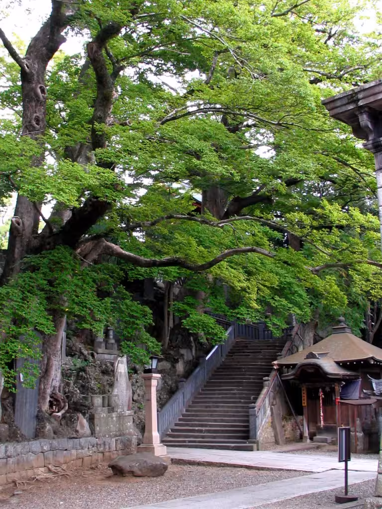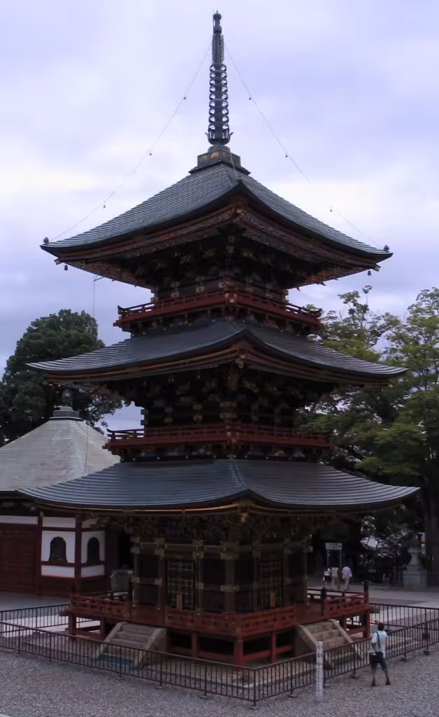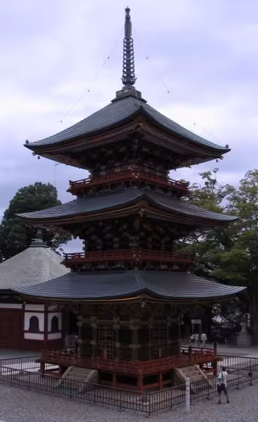 This temple is one of the most well known in the Kant region of Japan and is only surpassed in visitors during the O-shogatsu period (lit: New year period) by the Meiji Shrine in Tokyo. The temple grounds are composed of a main gate, a steep stairwell and the main buildings (including a couple of five-story pagodas), and a garden area with large pond. A very small zoo is also within the temple grounds.