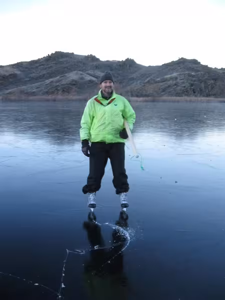 Dave Patchett playing hockey on the middle basin of the Manorburn dam
