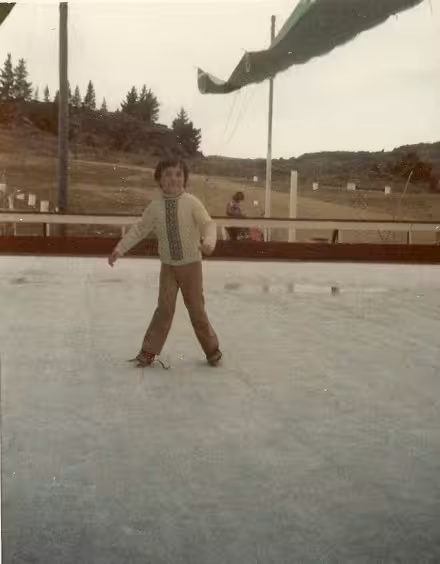 From left: Auntie Lynn, Ronald Hellyer, Pamela Hopkins, Uncle John, Dad and Robyn on the central basin of the Manorburn dam in 1954. The hand writing is courtesy of my Nana. From left is Ronald Hellyer, my Dad, some random guy, Phylis Hellyer and John Hellyer on the Manorburn dam in 1952.Dad on the Manorburn dam some time around 1970.Dad on the Manorburn dam some time around 1970.This is my brother Scott on the tiny ice cube they called a rink which sat beside the Manorburn dam. This would have been around 1984 I think.And this is Scott demonstrating why I'm the one who's still skating!