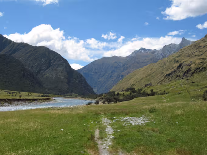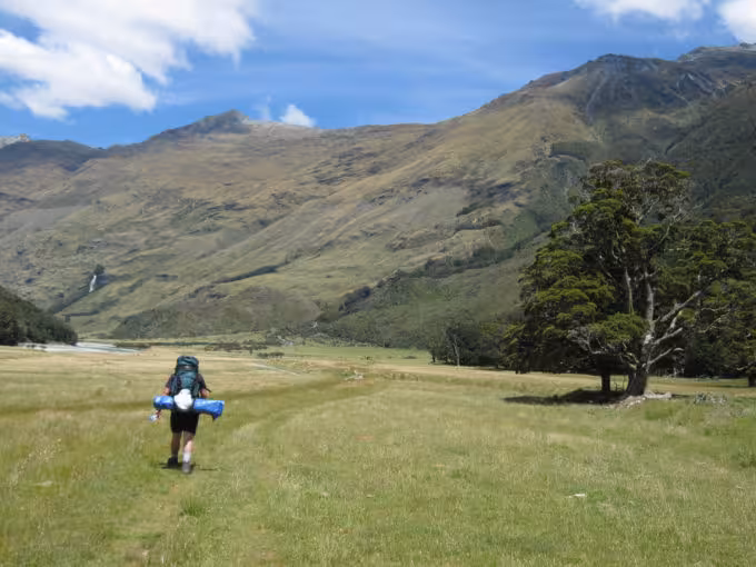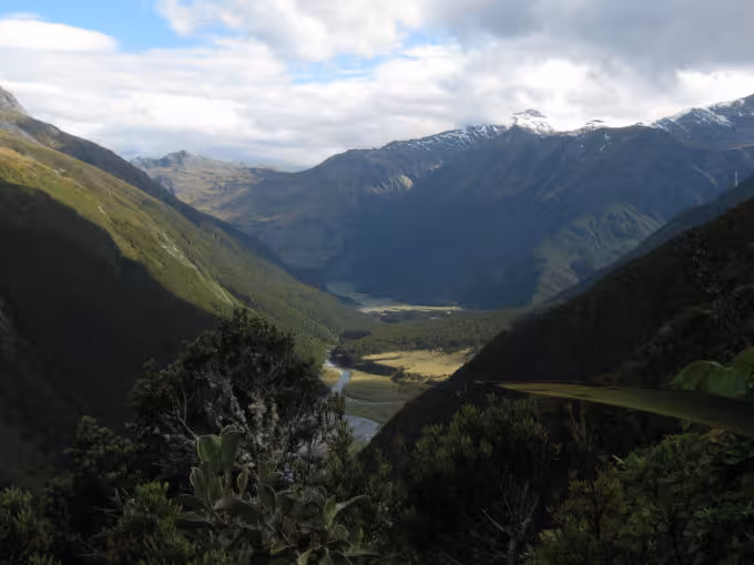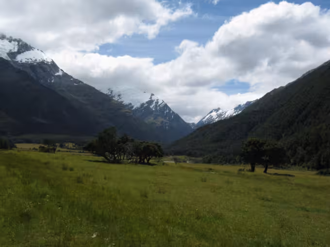 Shovel flat in West Matukituki valley. Mount Aspiring is hidden in clouds above and Pearl flat is behind the small mound of trees.