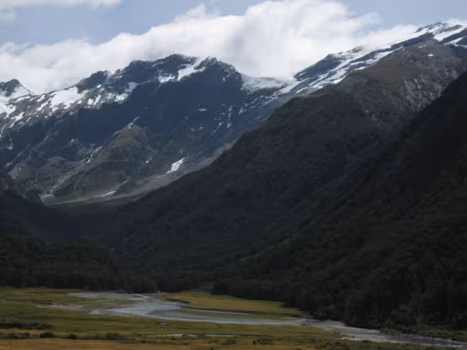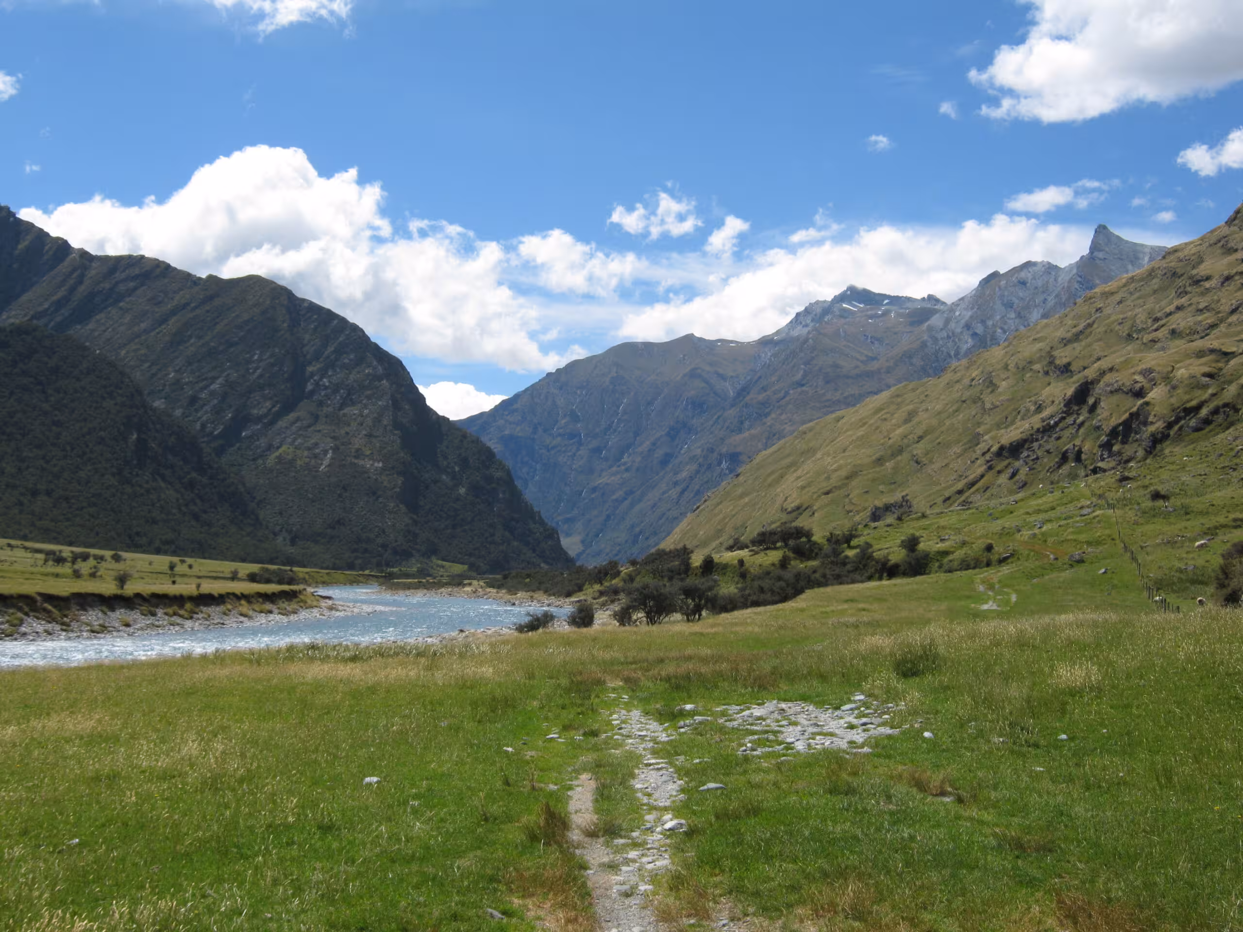 Shovel flat in West Matukituki valley. Mount Aspiring is hidden in clouds above and Pearl flat is behind the small mound of trees.