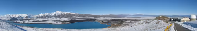 Panorama taken from on top of Mt St John (near Lake Tekapo) showing Lake Alexandrina. Download high resolution version.