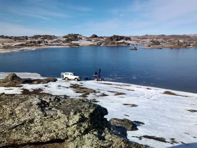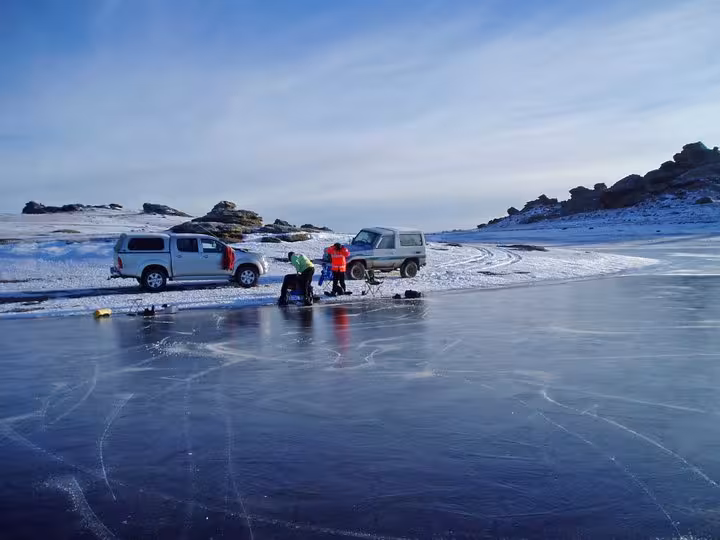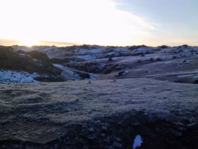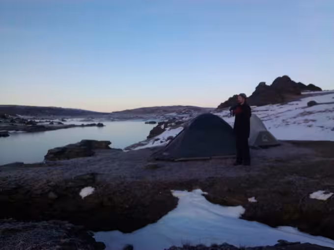 I went camping on the weekend with Ed Waite and Dave Patchett to Poolburn reservoir. We headed off on Friday evening packing tents, as much cold weather gear as we could find and a set of chains in the back Ed’s trusty Toyota Landcruiser. The road up to lake Poolburn was nicely frozen and easy to drive on, apart from a large puddle which Ed decided to travel through instead of around. The puddle was frozen, but apparently not enough to support the weight of a fully laden Toyota Landcruiser but Ed’s ninja awesome four wheel drive skills saved the day and we managed to get out of the ice hole in one piece (sort of …). We found a neat little flat spot perched above the dam where we set up camp with a beautiful view out across the frozen reservoir.