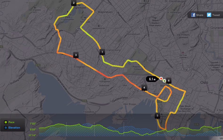 I ran the Sentrumsløpet in Oslo. 10 km in 61.5 mins in 2012 and 53 mins 46 seconds in 2013! There’s a dip in speed during the middle section as I got a really unpleasant cramp. Hopefully I can do even better for 2014 🙂 Here’s the trace from my Nike running watch.