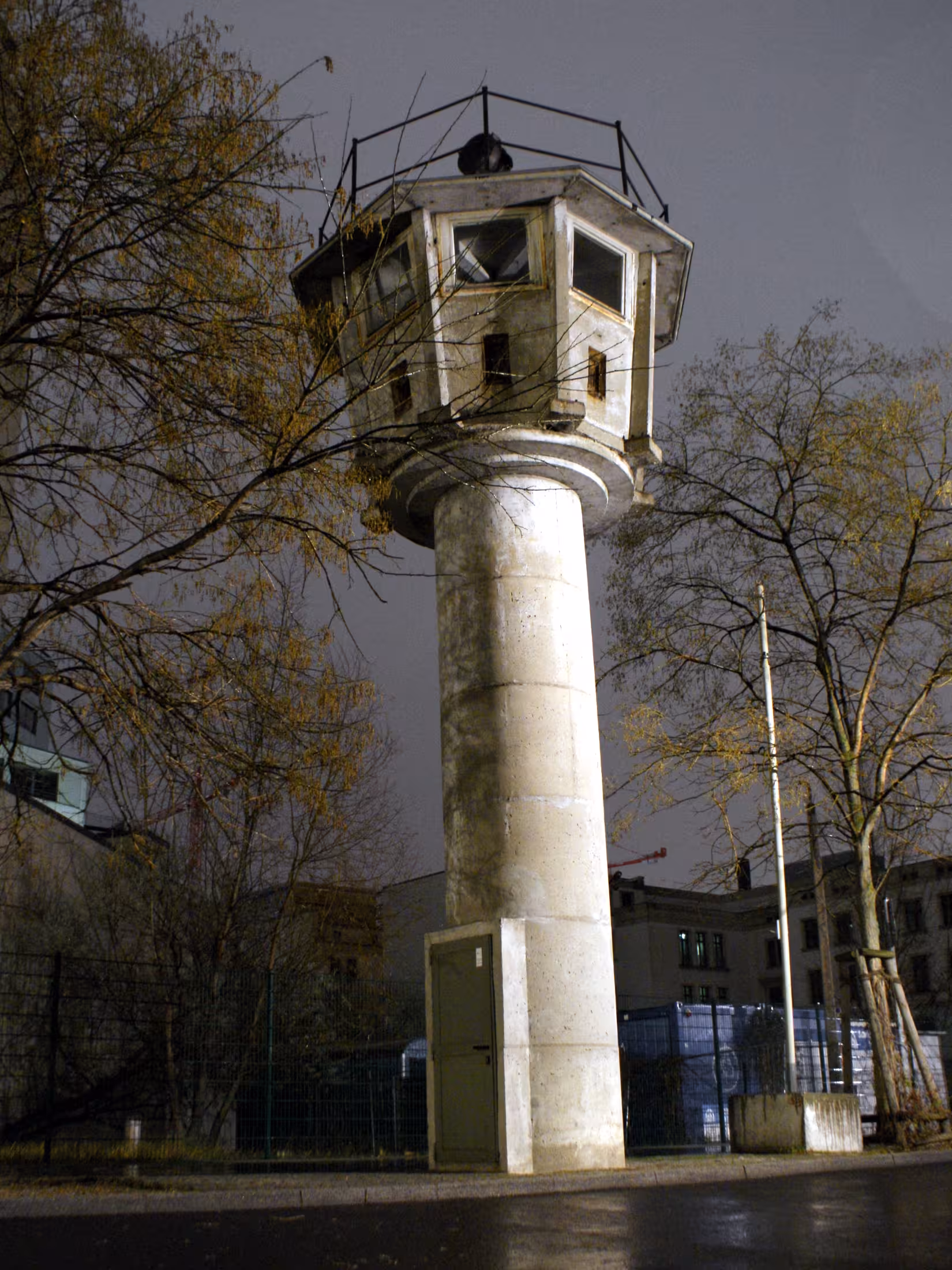 This is a preserved guard tower. These towers were used to keep an eye on the death-strip, a small section of land kept open on the eastern side of the wall in which people found entering it were shot on sight.