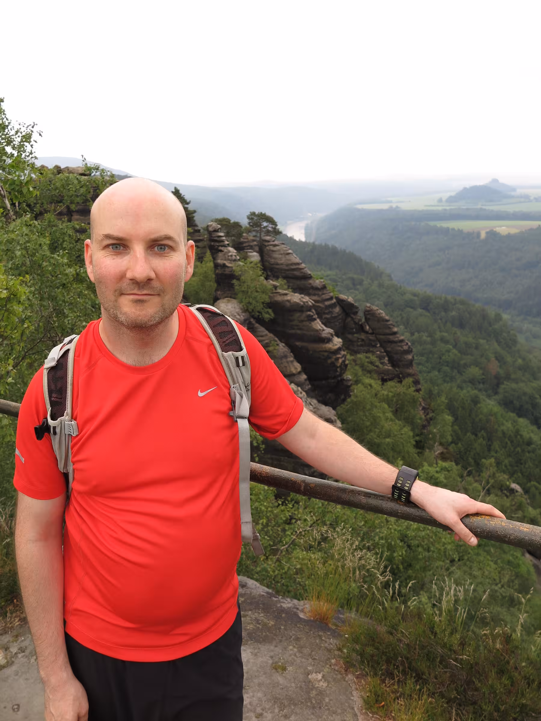 Some photos from once we reached the highest point of our hiking trip in Sächsische Schweiz. Me at the top. This photo’s URL was modified, because I didn’t want my fat gut showing up at the top of a Google search 😉