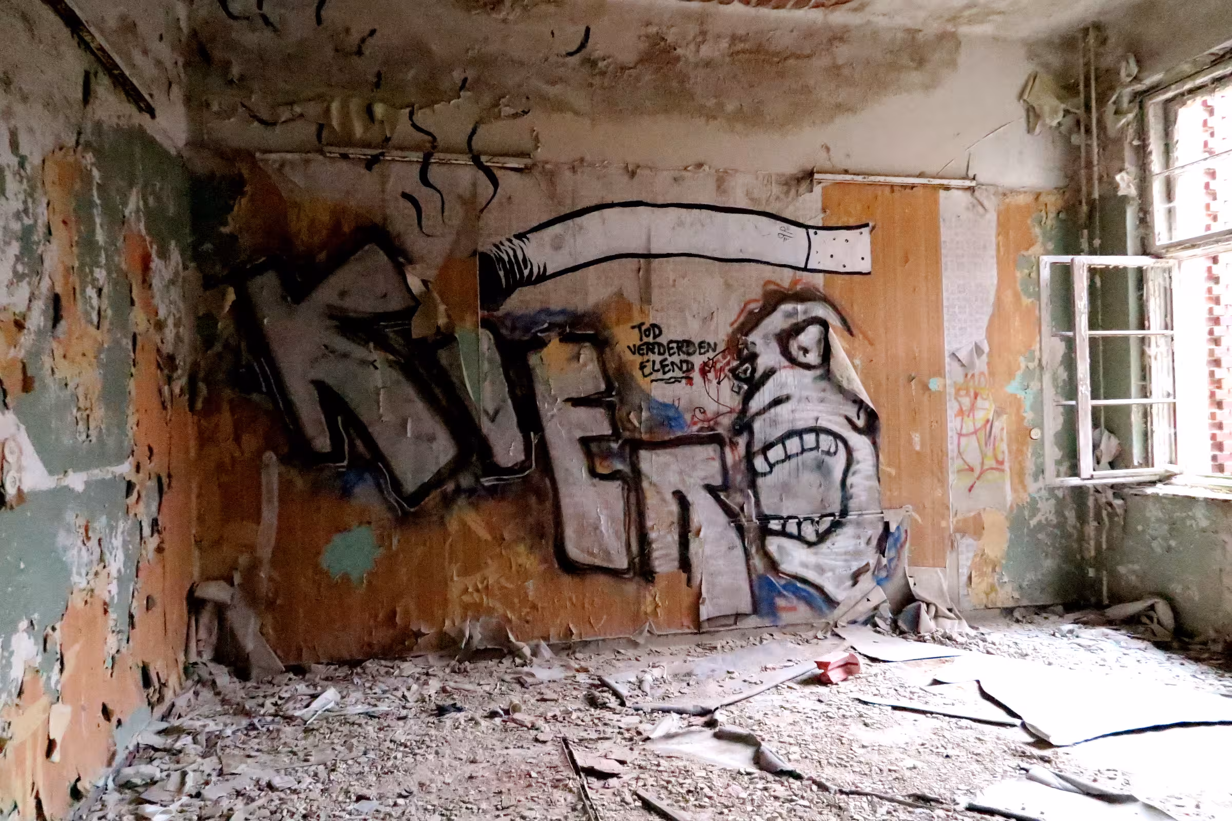 I’ve been to quite a few abandoned places now. But Beelitz-Heilstätten is definitely the biggest. It’s also one of the most remote as there’s not a lot else in the area. I think the size and remoteness has resulted in a lot less vandalism and graffiti inside the buildings. There were some interesting creations though, including instructions to trespass (check) and to teach children to worship Satan. The Satan comment was painted at the front of a large grand lecture hall.