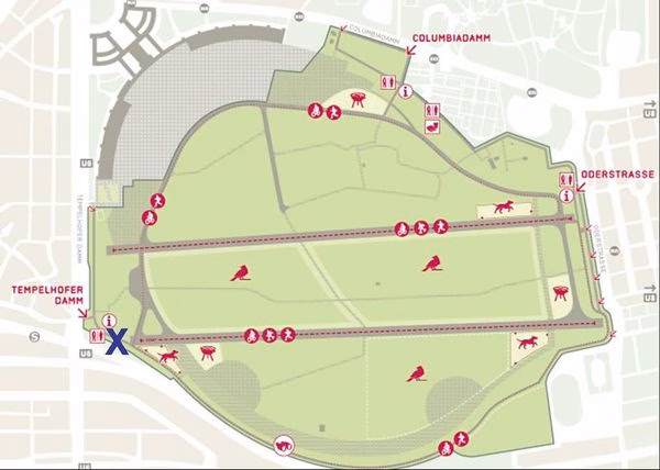 Closest public transport is S-Tempelhof (SΓΌdring S41/S42/S45) or U6-Tempelhof. Itβs is about 3 minutes from the entrance of the S-Bahn across Tempelhofer Damm, then you enter the park, pass a few bicycle racks, continue the path to the right hand and then there is already the toilet container and next to it two concrete benches, where people will be busy changing their shoes (see the big blue X in the lower left hand corner below)