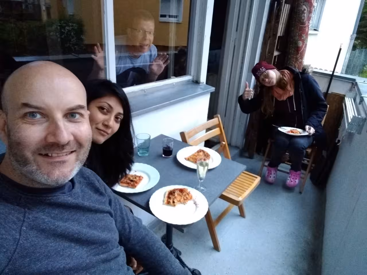 Madhvi and I broke the 2 m rule, whilst Craig kept himself locked behind glass (where he belongs) while did a small group pizza baking session 🙂 Me (Ryan Hellyer), Madhvi, Craig, Sophia