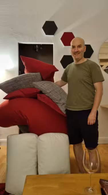 I assembled a pile for cushions to block the air conditioner from hitting Cassienne, and we decided it looked like an art exhibit ?